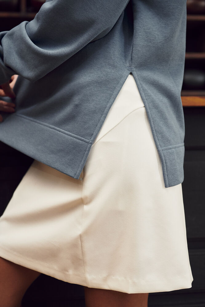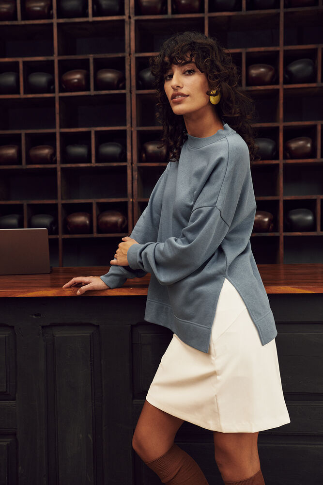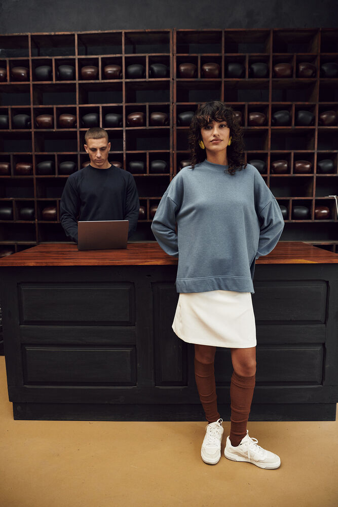 Een relaxede trui voor dames met ronde hals in French terry-kwaliteit, gemaakt van een mix van katoen en gerecycled polyester. De trui heeft licht afgezakte schouders en een split onderaan de zijnaden. De bredere elastische 2×2 rib heeft enkele stiksels bij de hals en onderkant van de mouwen. De trui is afgewerkt met een hoge zoom aan de onderkant, necktape van keperstof in contrastkleur en een gemakkelijk te verwijderen label voor rebranding. De zachte, gestabiliseerde stof is ontworpen voor intensief wassen en heeft een anti-pilling afwerking.