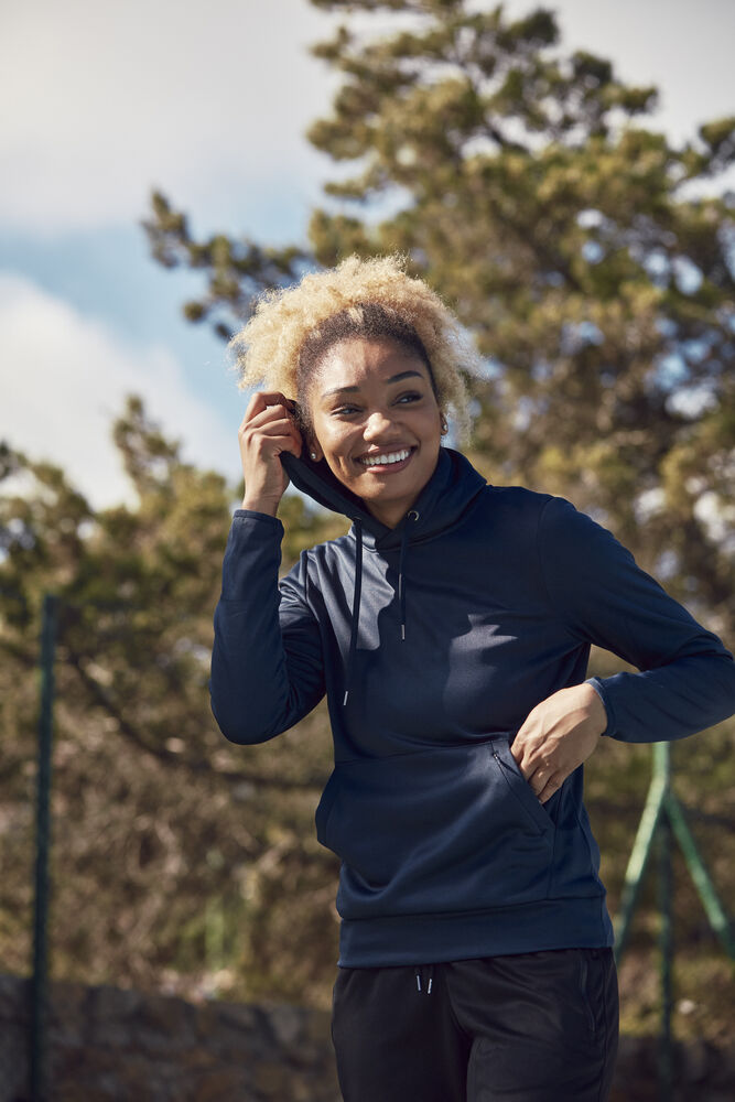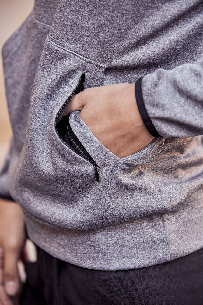 Hoogwaardige trui met capuchon en een moderne pasvorm. De trui is gemaakt van zacht, soepel en comfortabel polyester. De capuchon is gemakkelijk te verstellen middels een trekkoord. Verder heeft de trui een buidelzak op de voorzijde met een extra zak met rits. De behandeling met softener zorgt ervoor dat de trui zacht aanvoelt.