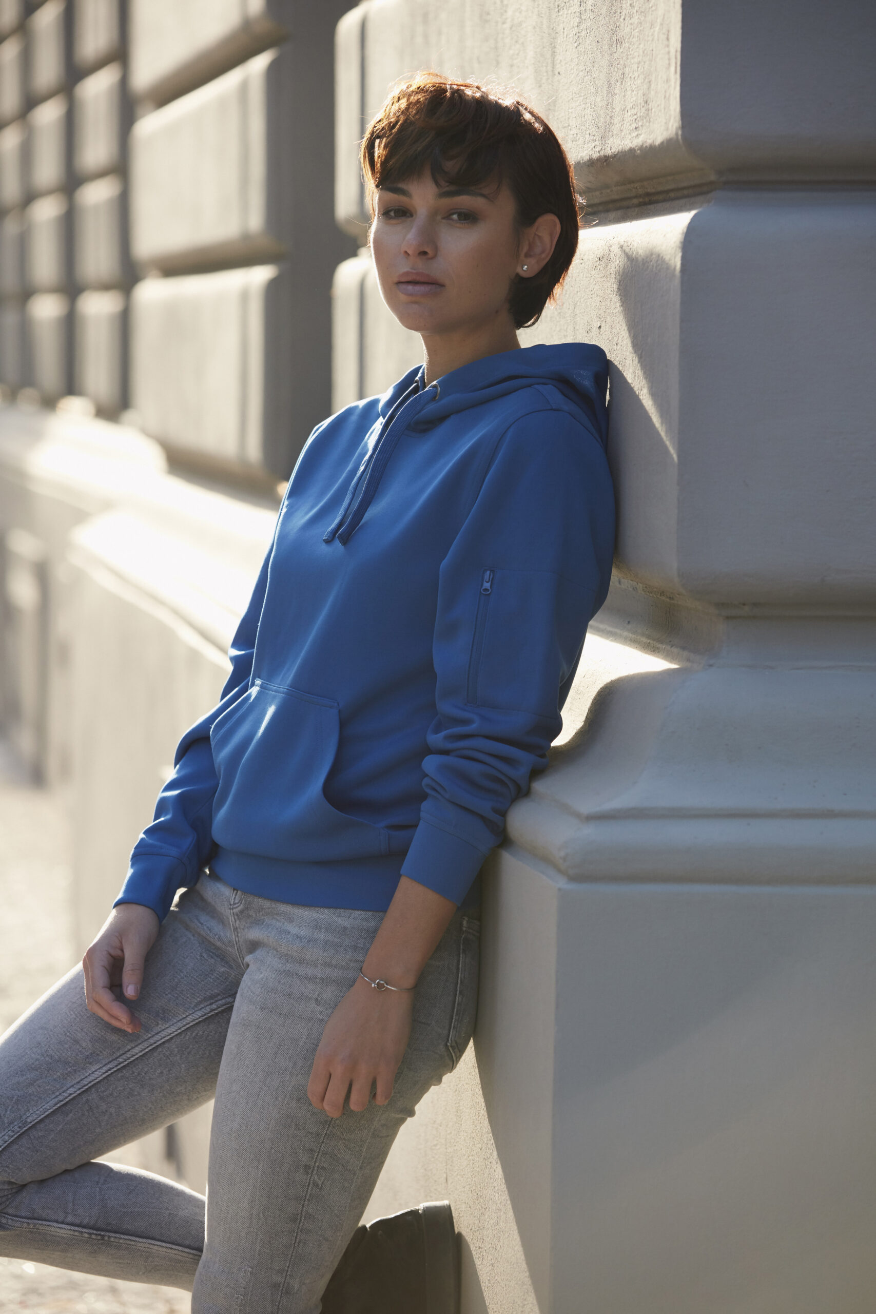 Moderne sweater met capuchon voorzien van een doorvoer voor een koptelefoon, buidelzak en ton sur ton zak op de mouw met rits. De sweater is ingeverfd door middel van Spun Dyed. Het trekkoord in de capuchon, de rib in de boord en onderaan de mouwen en het visgraat necktape geven de sweater een verzorgde uitstraling. De sterke prijs-/kwaliteitverhouding maakt van deze sweater een gegarandeerde bestseller.